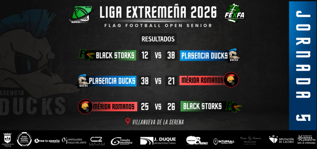 El pasado 21 de marzo, el Anexo Municipal Villanovense acogió la Jornada 5 de la VIII Liga Extremeña de Flag Football Open, donde los Plasencia Ducks firmaron una actuación muy completa para colocarse líderes con un sólido 4-0.